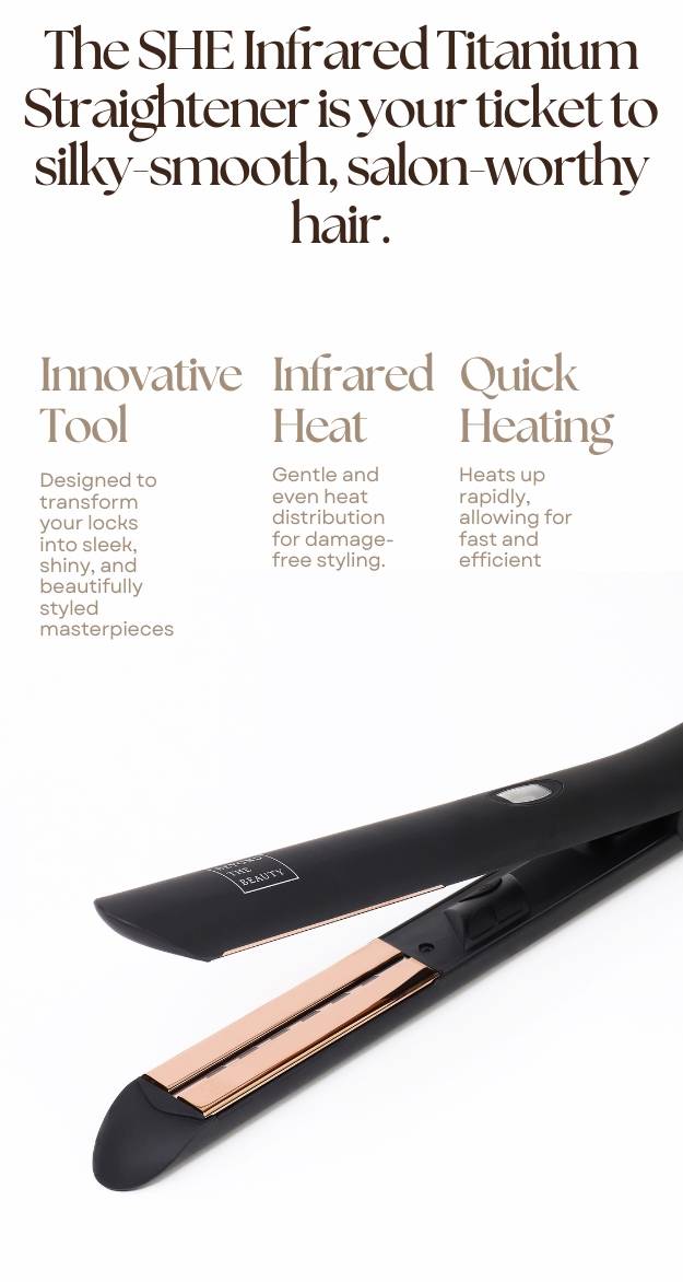 Introducing the SHE Infrared Titanium Straightener, your passport to hair perfection and unparalleled styling innovation. This cutting-edge straightener is meticulously designed to deliver salon-quality results in the comfort of your home.
